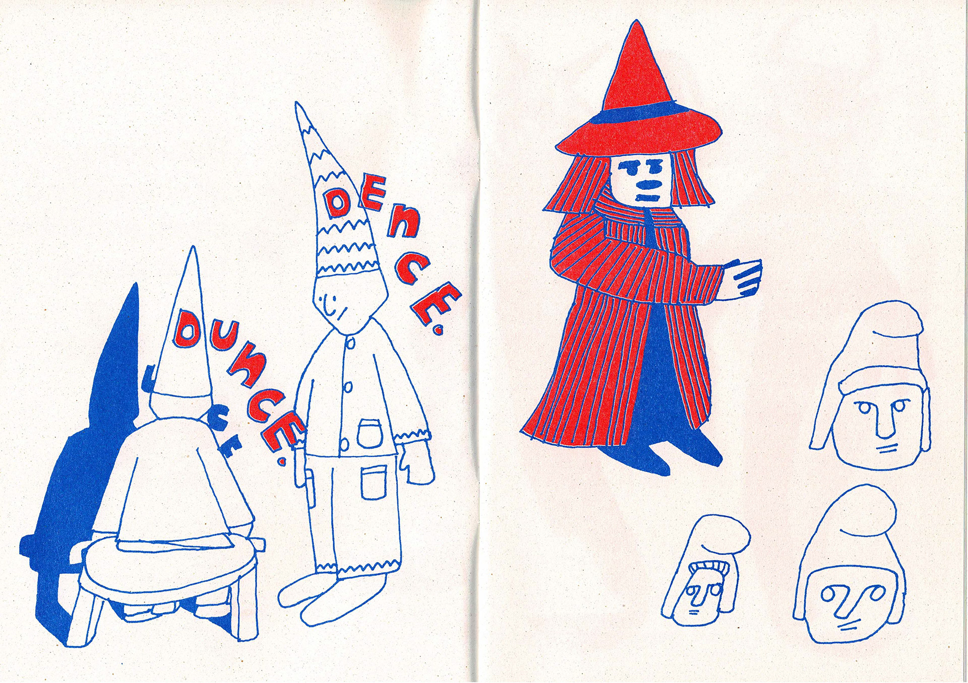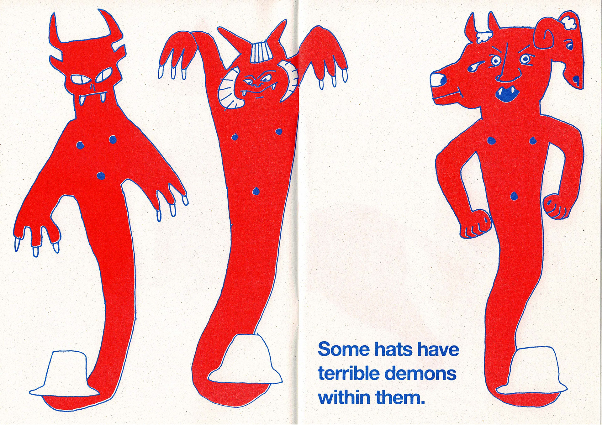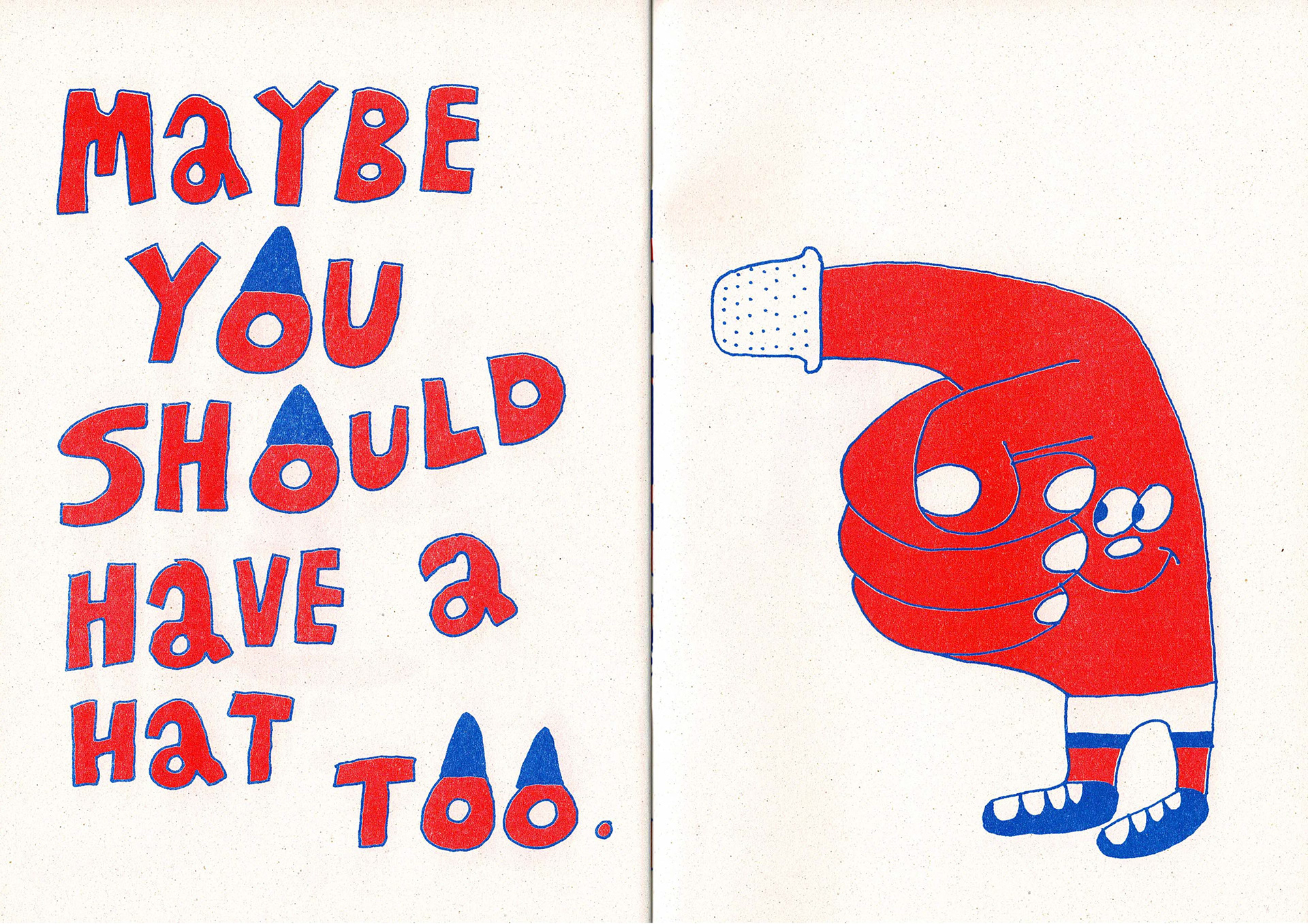 Some spreads from the 'Look At My Hat' zine I made, riso printed in red and blue. The zine has 20 pages altogether that feature different characters wearing different hats.