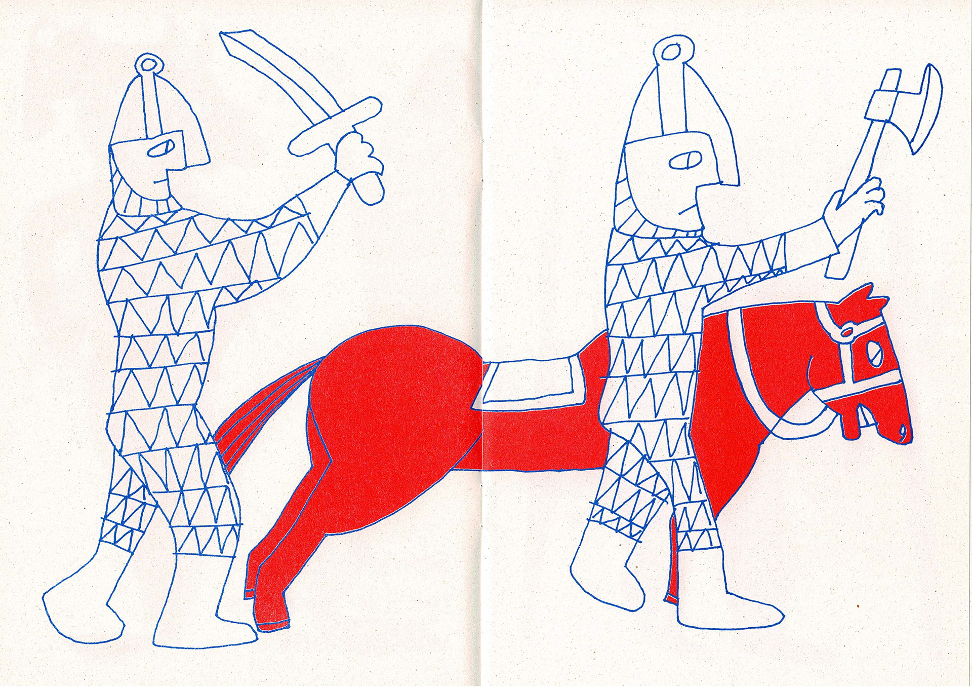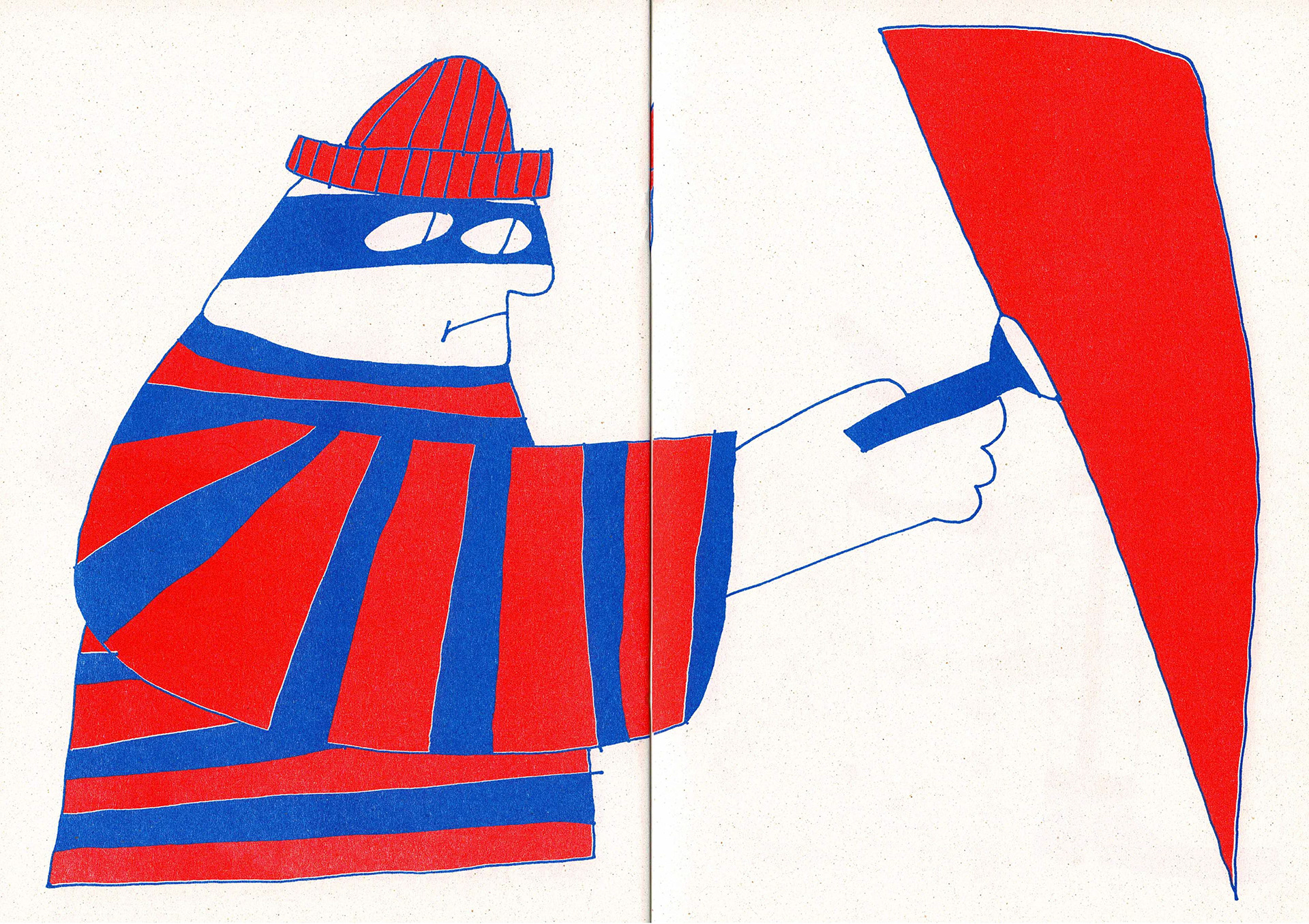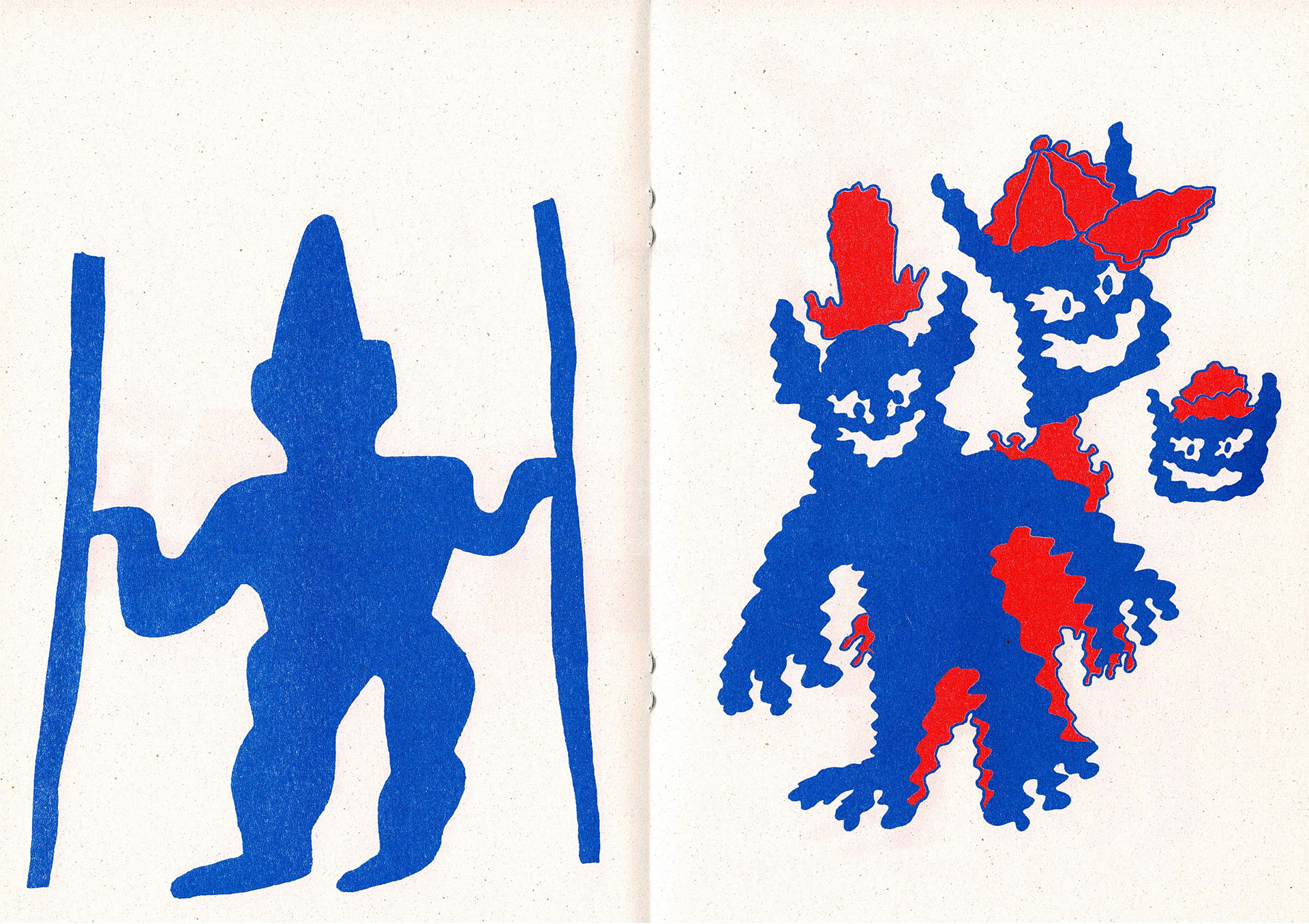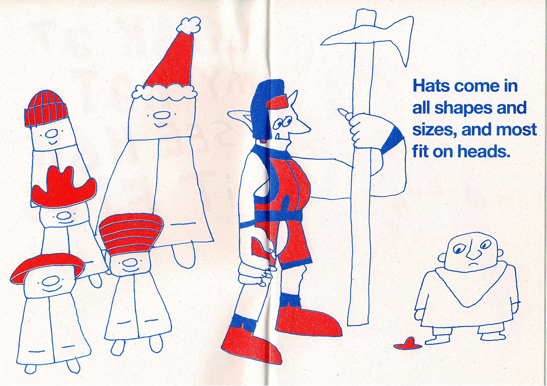 Some spreads from the 'Look At My Hat' zine I made, riso printed in red and blue. The zine has 20 pages altogether that feature different characters wearing different hats.